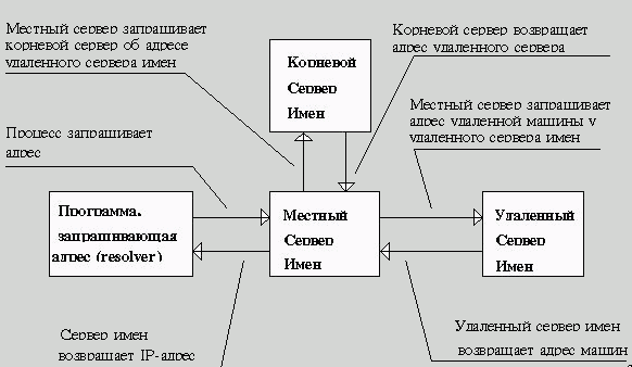 Любой сервер имен имеет зону своей ответственности. Для того чтобы получить адреса или имена машин, которые не входят в зону его ответственности, сервер обращается к другим серверам имен. В принципе в поисках адреса или имени запрос может пропутешествовать до корня системы доменов, а затем снова спуститься до локального сервера имен. При поиске имени resolver формирует запрос и посылает его своему серверу имен. Сервер имен пытается найти имя в своей базе данных. Если ему это удается, то ответ возвращается resolverу, в противном случае он запрашивает сервер, стоящий выше него в иерархии доменов. Этот сервер обычно называют корневым. Корневой сервер находит сервер, в чей домен попадает указанное в запросе имя, и указывает адрес этого сервера серверу, с которого поступил запрос. Сервер, найденный корневым сервером, называют удаленным сервером. Локальный сервер устанавливает взаимодействие с удаленным сервером и получает от последнего необходимую информацию.
